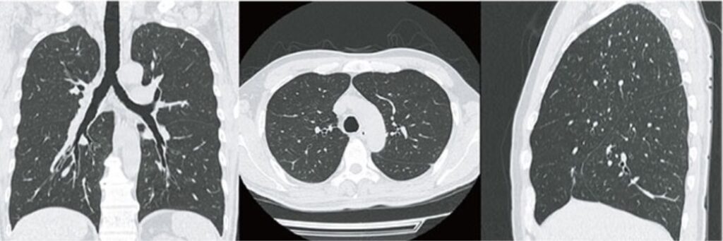 上記レントゲンと同じく胸部をCT検査した場合の画像です。三次元にて任意断面での診断が可能です。
