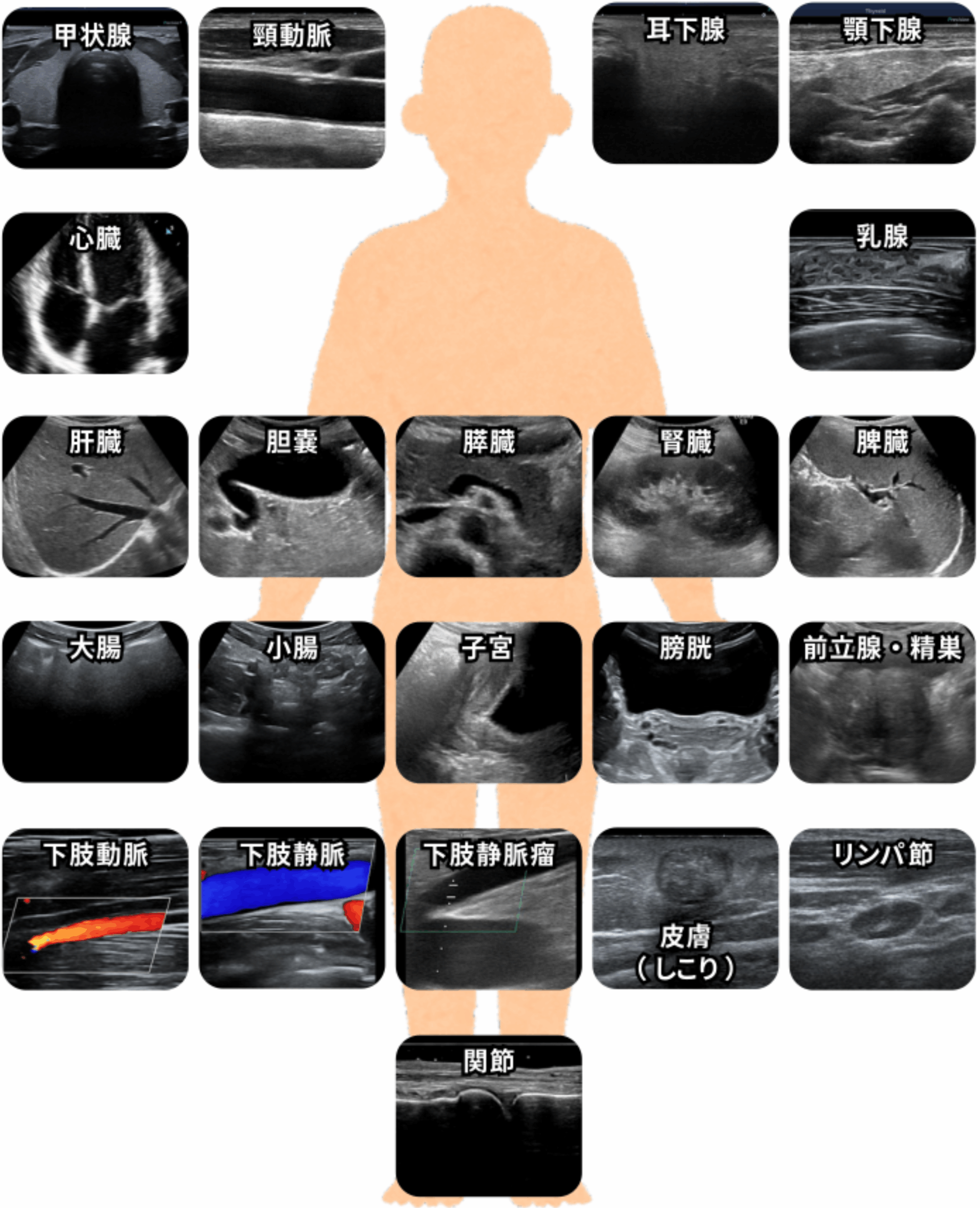 - 血管系:心臓、頸動脈、腹部大動脈、下肢動脈・下肢静脈・下肢静脈瘤